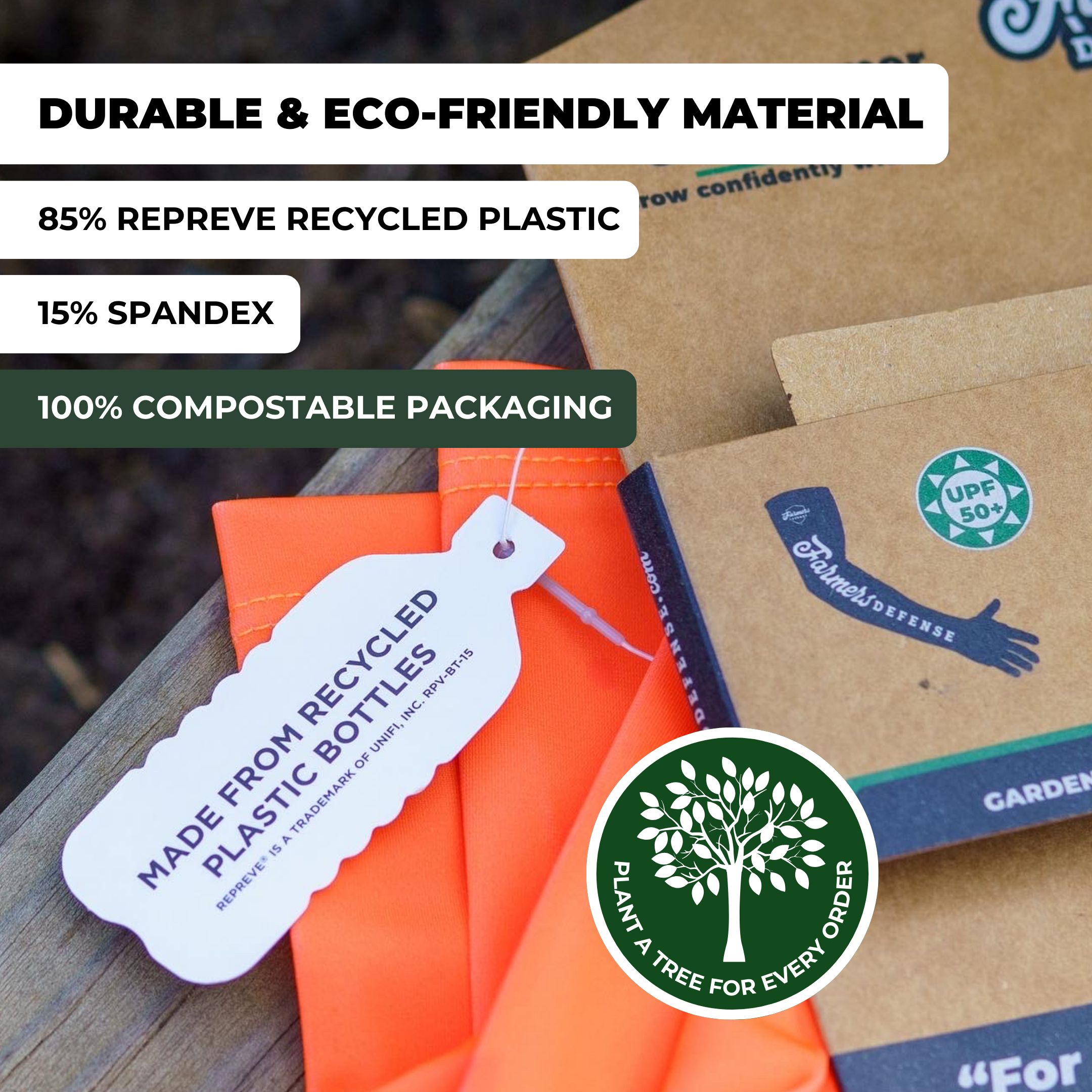 Eco Friendly: Farmers Defense products are made out of Repreve polyester which is made out of recycled plastic bottles. Not only that but their packaging is made of 100% recycled material all the way down to the mailers they arrive in! Oh and not to mention that for every order they plant a tree?!? 🤯